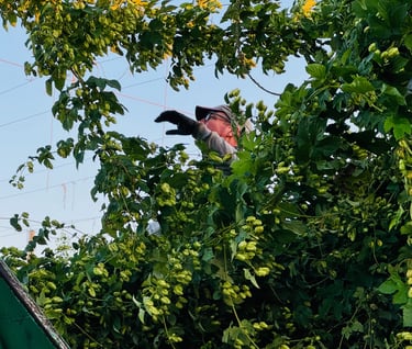 "Le Houblon est une plante pérenne aux vertus plébiscitées. Comme la vigne, elle est palissée, à 7 mètres de haut, et les travaux saisonniers sont assez proche (taille, épamprage, travaux du sol et effeuillage) tout au long de l'année jusqu'à la récolte. Ses caractéristiques aromatiques (Agrumes, fleurs, épices...) et ses propriétés (antioxydative, antifongique...) en font une plante recherchée par les Brasseurs quand elle est de qualité".